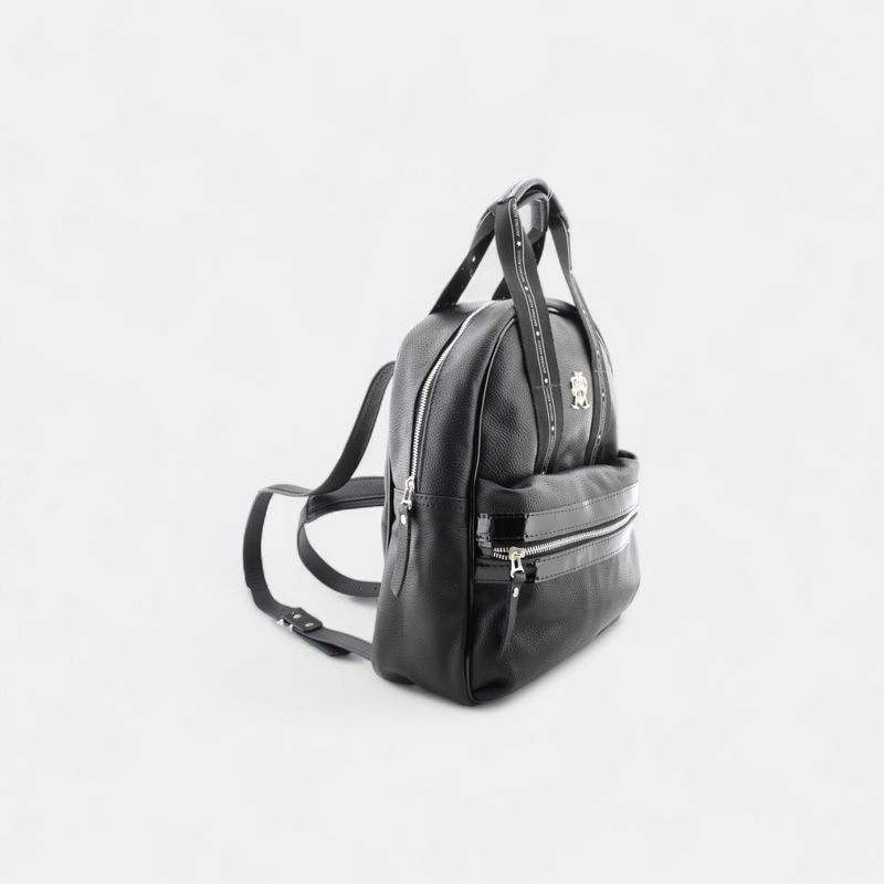 Bolsillo frontal con cierre metálico y bolsillos laterales externos para mayor practicidad.