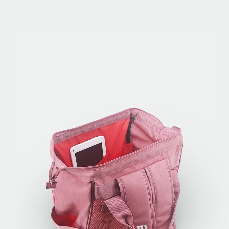 Bolsillo Frontal: Un compartimento secundario con cierre horizontal que incluye la leyenda "Wilson Sporting Goods Co." en contraste.