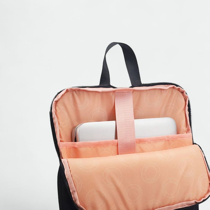 Diseño: Estructura rectangular de perfil delgado y estilo urbano, diseñada específicamente para el transporte seguro de dispositivos electrónicos.