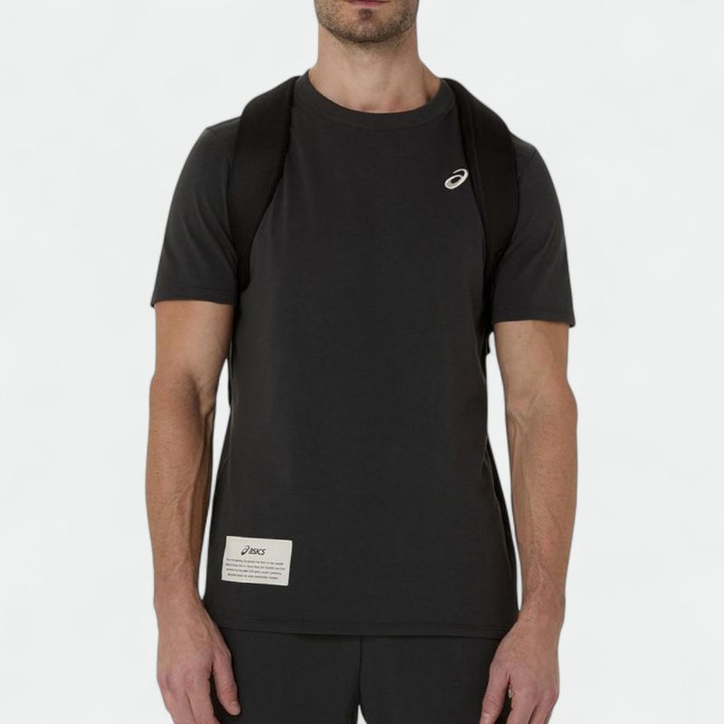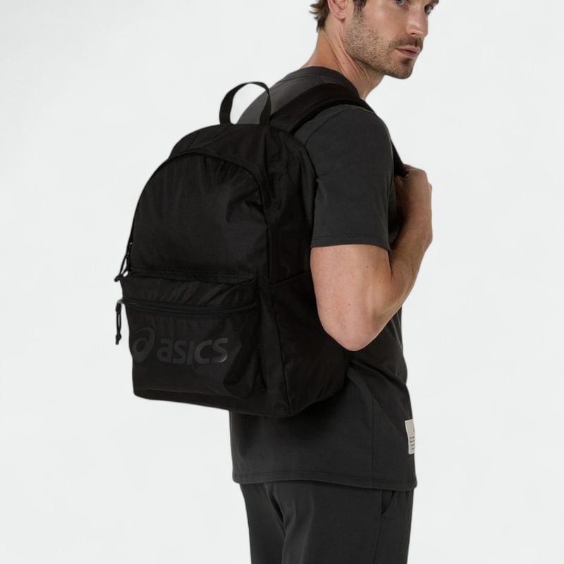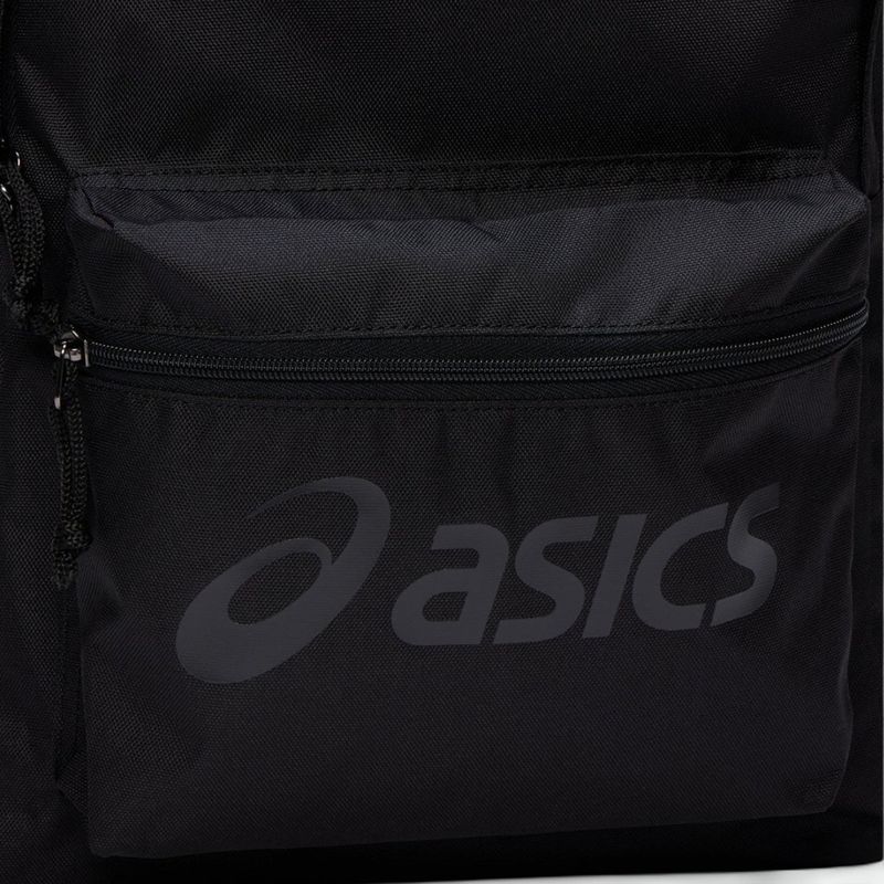 Detalle de Marca: El nombre y logotipo de "asics" resaltan en color blanco sobre el bolsillo delantero.