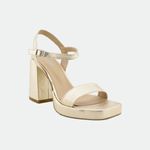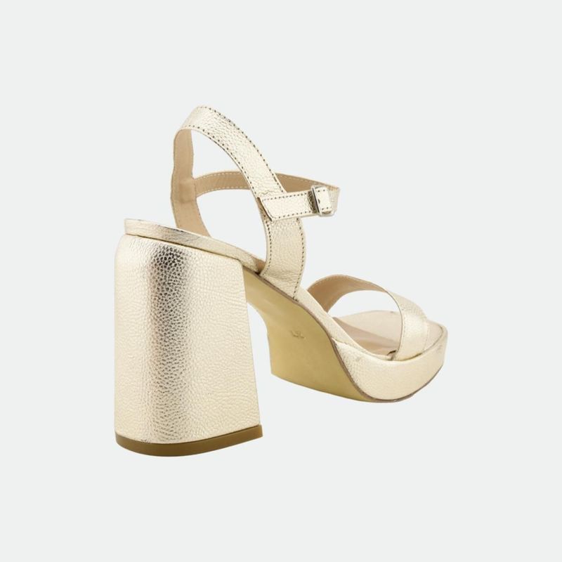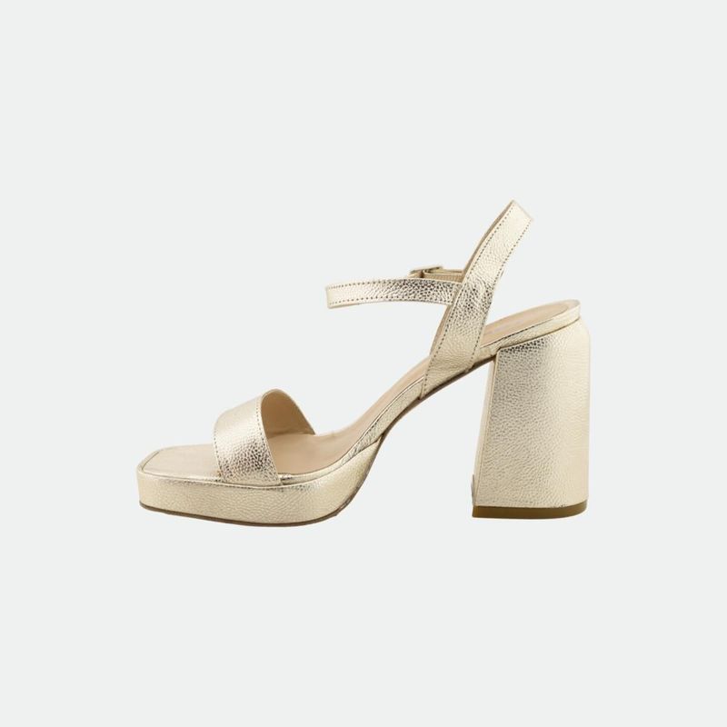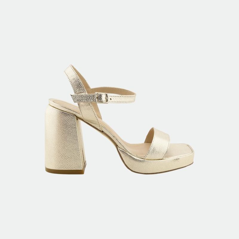 Estas elegantes sandalias cuentan con un taco de 11 cm y un diseño moderno que combina un bloque robusto con una sofisticada tira metálica. Perfectas para ocasiones especiales, ofrecen tanto estilo como comodidad, realzando cualquier atuendo con su brillo distintivo.