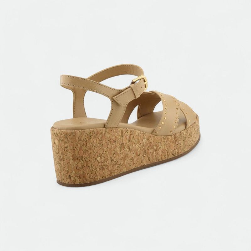 Tiras cruzadas decoradas con microtachas metálicas, que aportan un toque moderno y sofisticado.