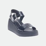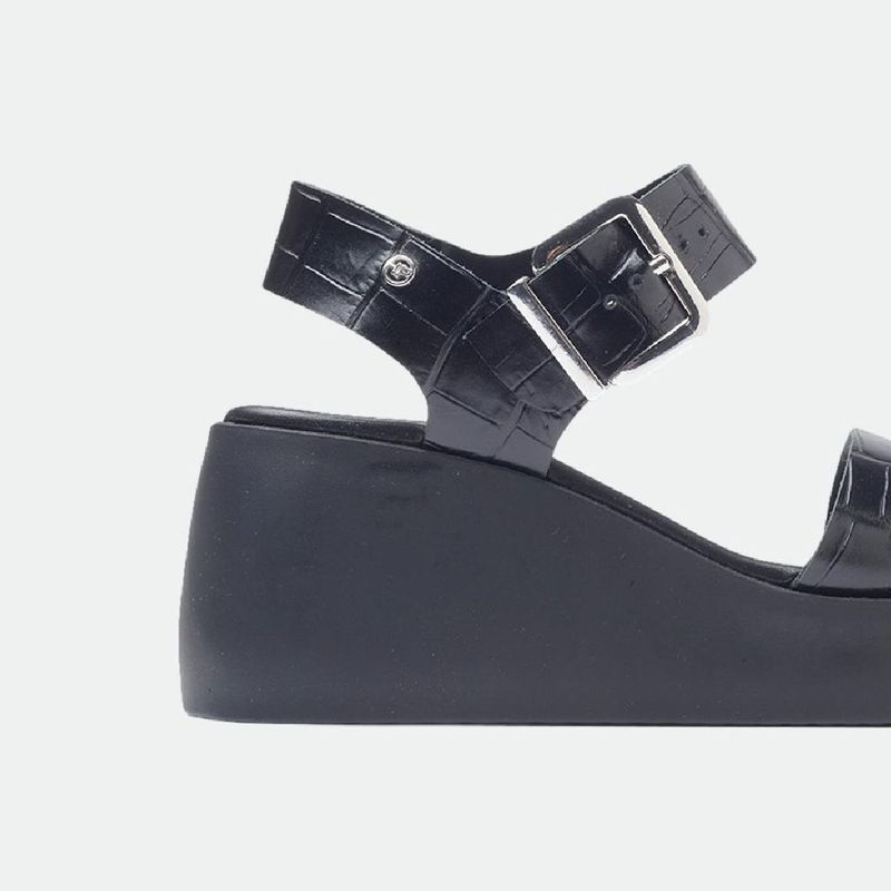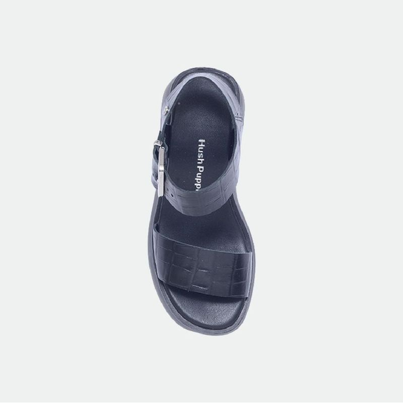 Sandalia Hush Puppies en cuero croco con faja y pulsera con hebilla metálica y aplique circular metálico con identificación HP. Plantilla acolchonada de material sintético con identificación de la marca. Fondo con una altura en talón 6,5cm y altura en puntera 3cm.