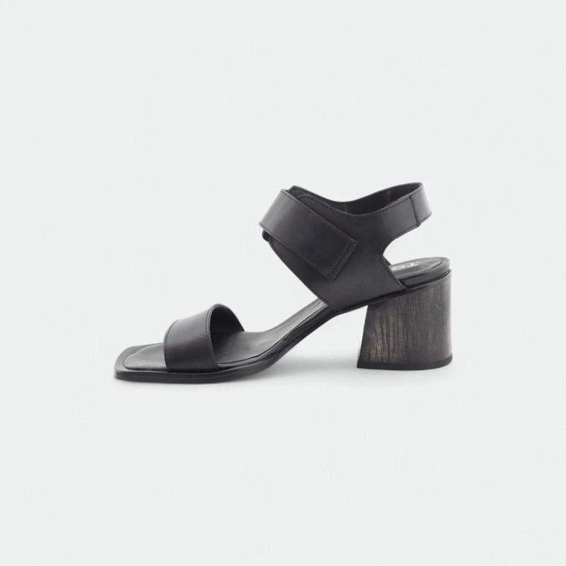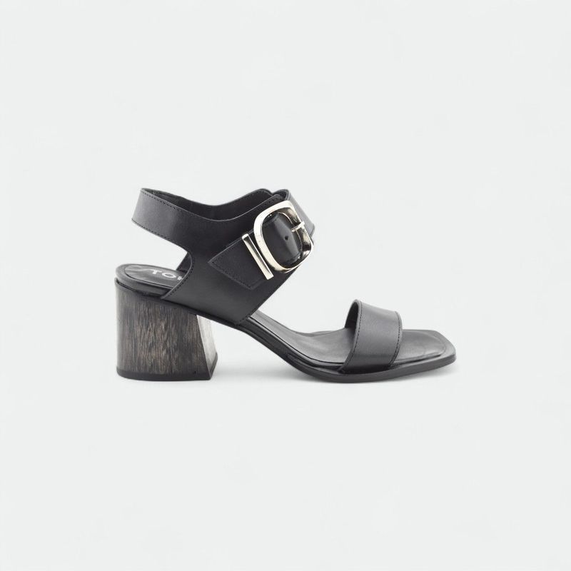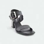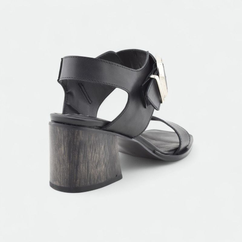 Sandalia confeccionada en cuero con hebilla metálica al tono. Punta cuadrada y tiras anchas que aseguran el pie con comodidad. Taco ancho de 7 cm en acabado madera, que brinda estabilidad y estilo.