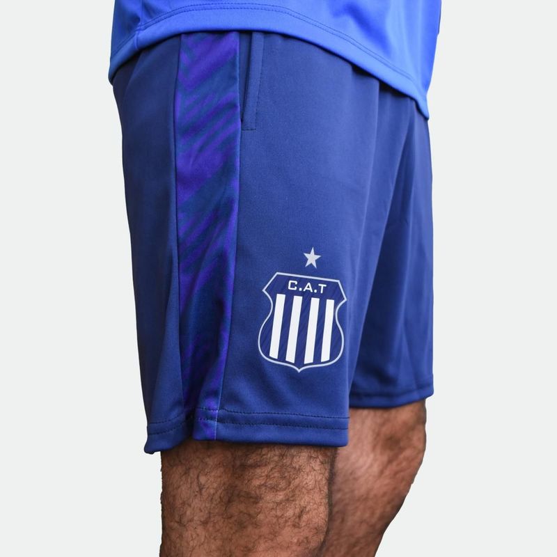 Short de entrenamiento 2025 con cierre, detalles estampados, color azul marino y detalle en violeta.