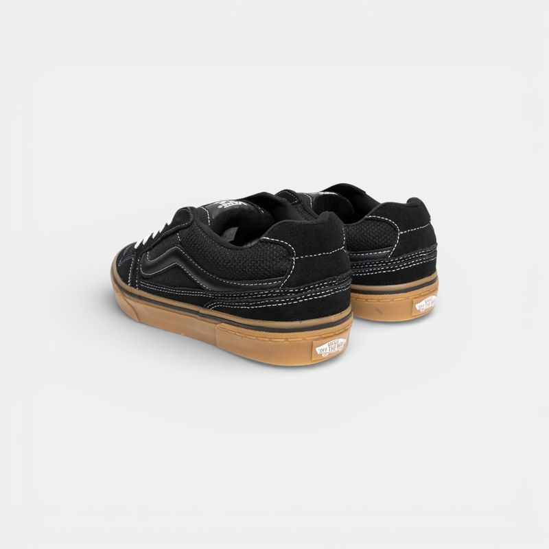 Influenciado por los zapatos estilo patinaje de los años 90, el Caldrone cuenta con una unidad inferior vulcanizada progresiva, una parte superior de varios paneles con una raya lateral Vans de gran tamaño, acolchado exagerado en el cuello y la lengüeta para mayor comodidad y apoyo.