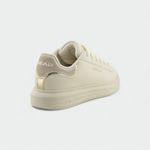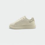 Cuenta con cordones anchos y planos de color crema o blanco roto, que son un elemento de diseño destacado.