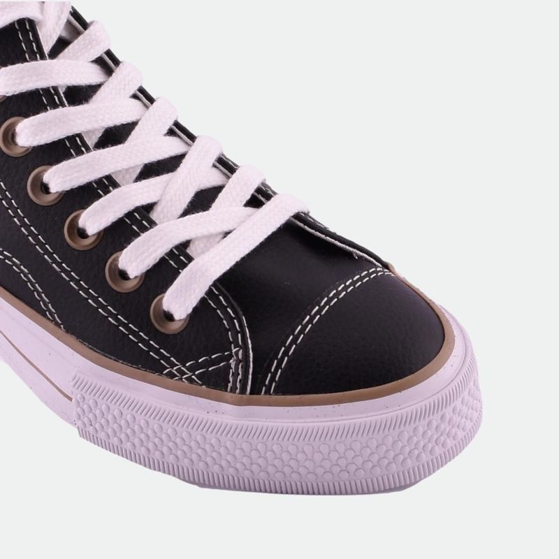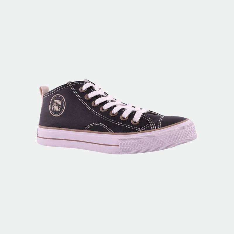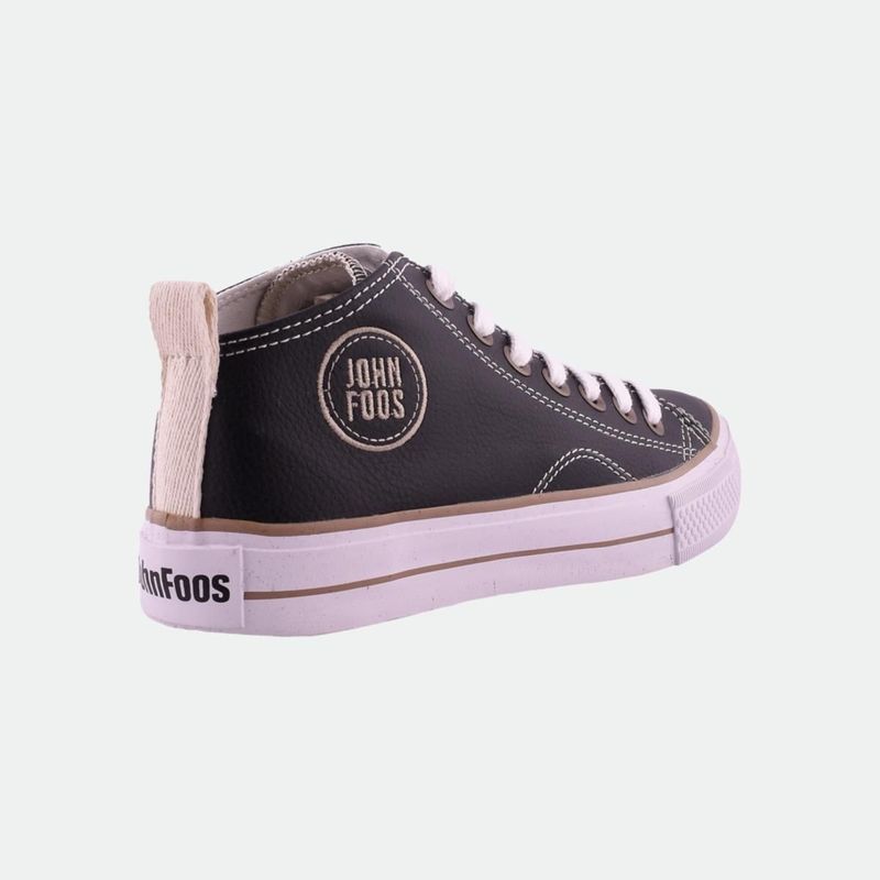Modelo icónico John Foos de la década del ´90, reeditado para el 40° aniversario de la marca. Zapatilla de media caña en cuero ecológico negro con bordado de logo retro. Detalles: Capellada y caña en cuero ecológico negro. Cinta de talón para calce en cuero ecológico color negro. Forrería hecha 100% de microcanvas crudo. Etiqueta textil “heritage” blanca con logo y leyenda de la marca en color negro. Ojalillera de bronce. Cordones chatos 100% algodón negros. Costuras hilo color beige. Plantilla extraíble confeccionada en caucho moldeado y base textil. Base de caucho vulcanizado color negro. Banda alta de caucho con doble filete. Contrafuerte de caucho recuperado.
