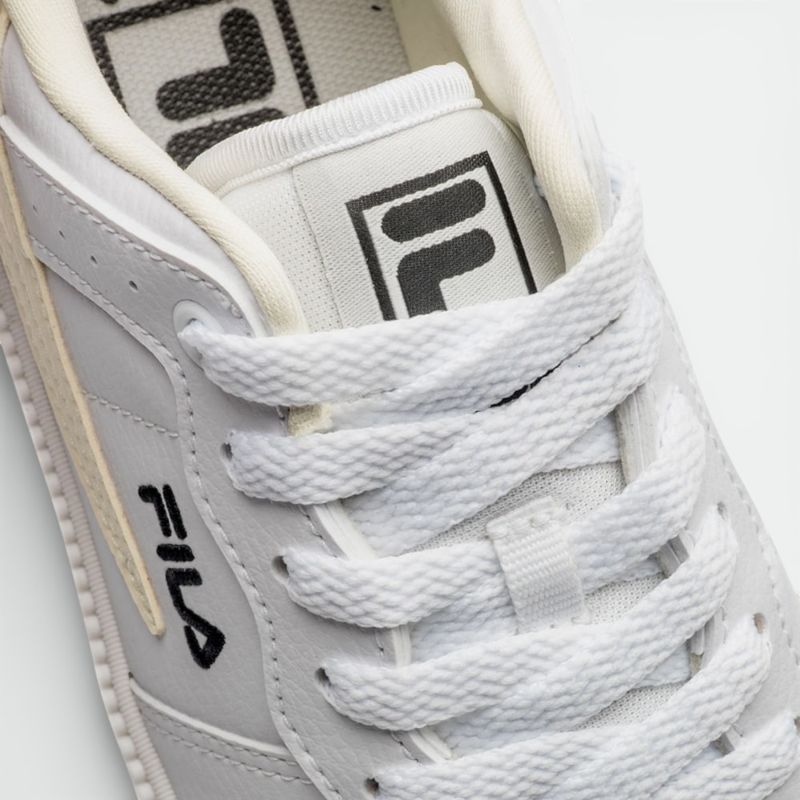 Sistema de cierre mediante cordones planos blancos que aseguran un calce firme.