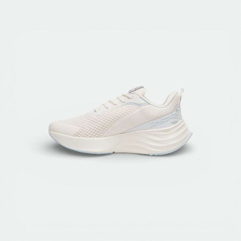 Parte superior de malla respirable con piezas sintéticas aplicadas en las zonas que necesitan refuerzo. Cuenta con un cordón personalizado, gráficos geométricos personalizados y un tirador trasero para facilitar su colocación. El diseño maximalista de la suela proporciona mayor protección y durabilidad, compuesta por una entresuela de EVA, que ofrece comodidad y suavidad, y clavos de TPU que ofrecen mayor agarre al suelo. La suela mide 3cm aproximadamente.