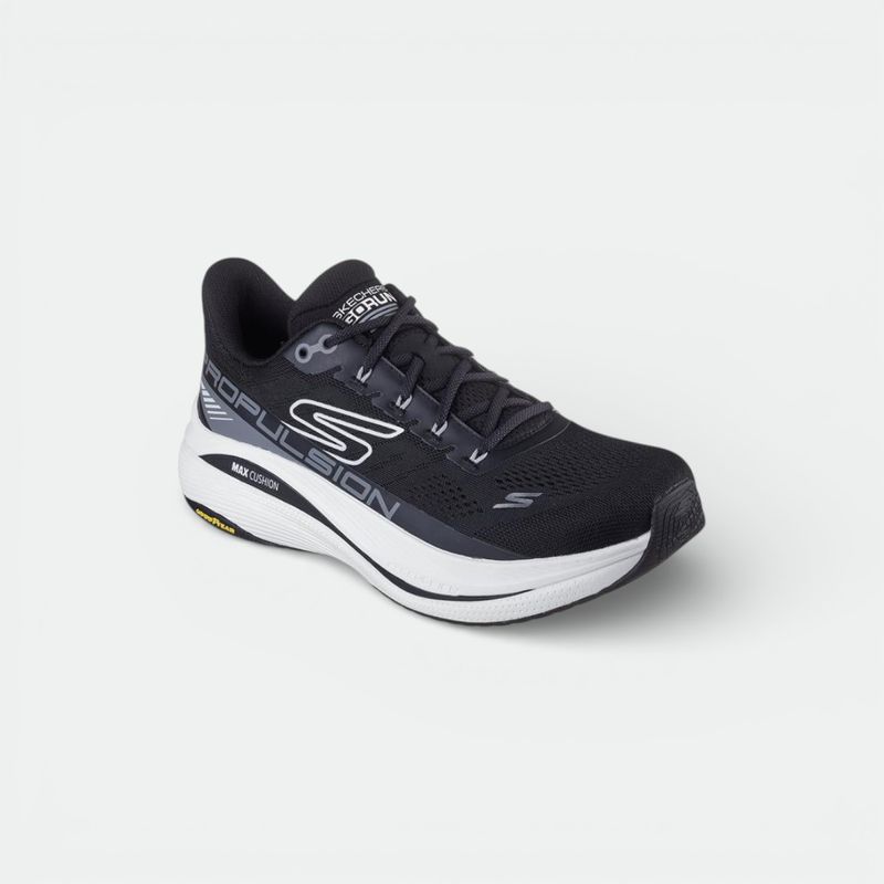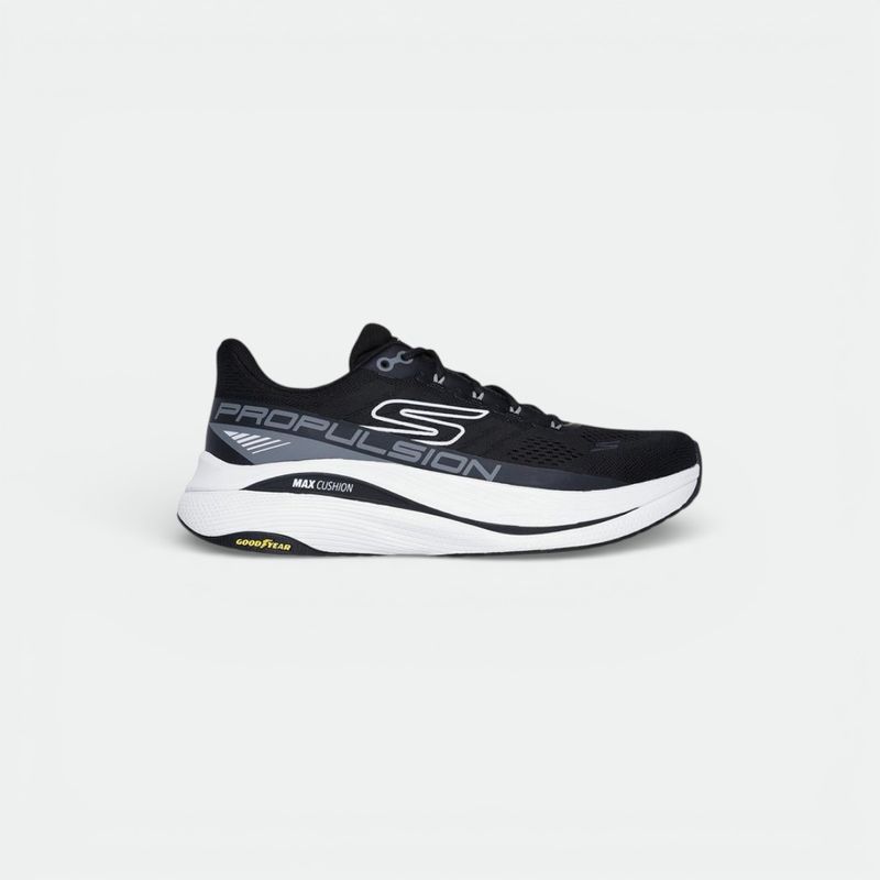 Mejora tu rendimiento con la máxima comodidad con Skechers Max Cushioning® Propulsion. Este modelo vegano para correr, confeccionado con materiales reciclados, presenta una parte superior de malla diseñada con una plantilla Skechers Air-Cooled Goga Mat™, una entresuela Max Cushioning® excepcionalmente cómoda y una suela exterior de caucho Goodyear® antideslizante. Our Planet Matters®: bueno para tus pies. Bueno para el mundo.®