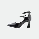 Confeccionado en cuero sintético con acabado brillante, presenta una elegante punta afilada que estiliza la silueta del pie. Se distingue por sus dos tiras con hebillas que abrazan el tobillo, brindando un ajuste seguro y un toque de diseño único. El tacón de 8.5 cm tiene una forma contemporánea que aporta altura con estabilidad y un atractivo visual distintivo.