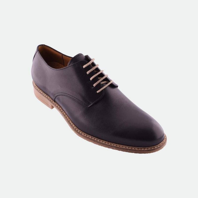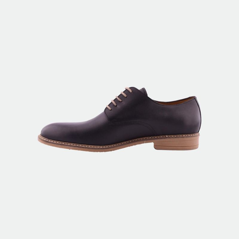 Zapato de vestir/sport, acordonado, horma semi-cuadrada. Esta íntegramente confeccionado en cuero vacuno y forrado también en vacuno. La suela es de goma con gran flexibilidad y vira montada sobre la misma.