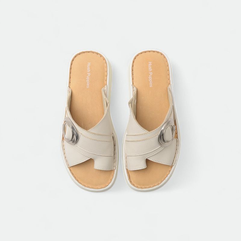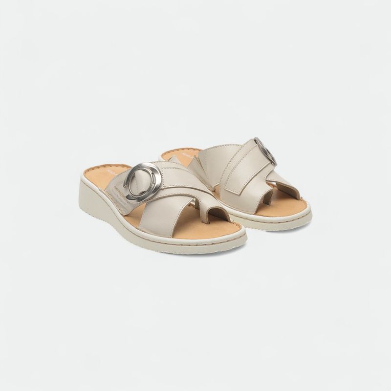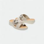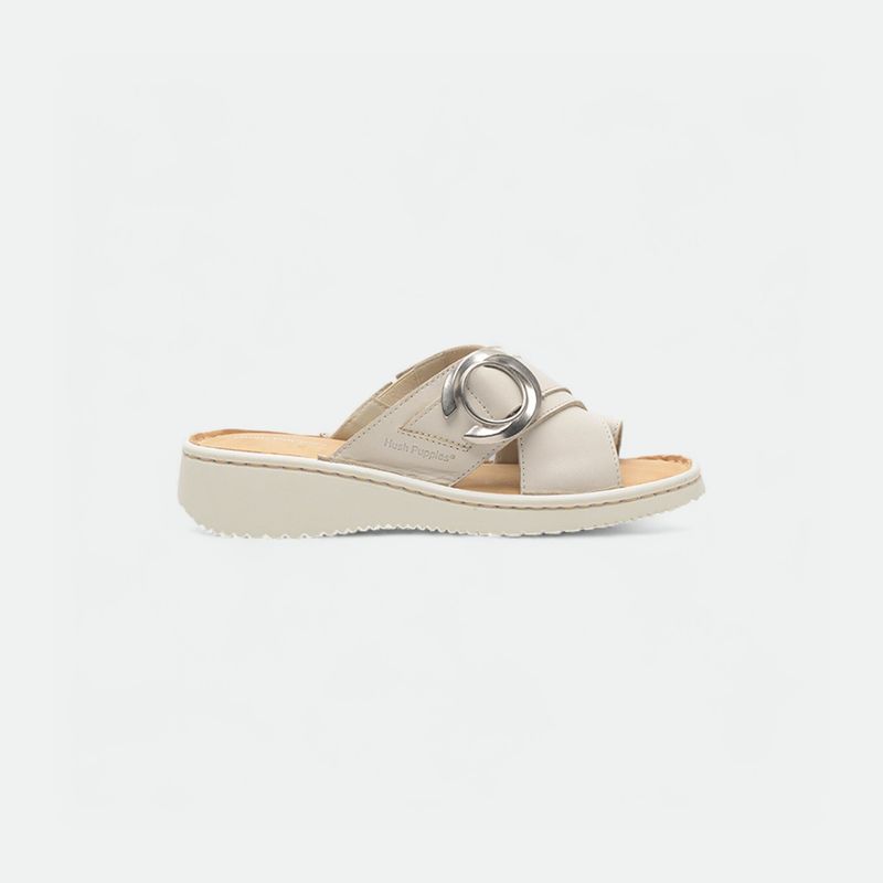 Sandalia Hush Puppies en cuero con doble faja y dedo. Aplique de pasador metálico. Plantilla en cuero descarne con la identificación de la marca. Fondo de pu con una altura total de 4,5Cm